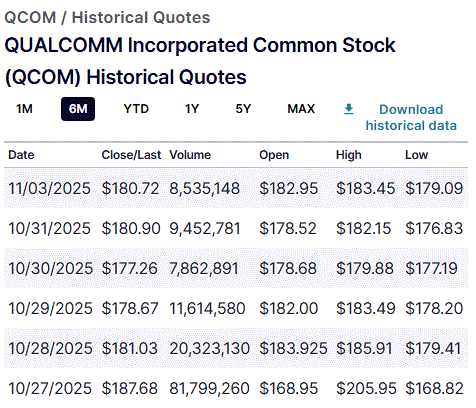 QUALCOMM Incorporated Common Stock (QCOM) Historical Data | Nasdaq |