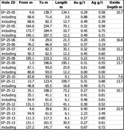 • SP-25-09: 195.1 m @ 0.31 g/t Au, including 25.9 m @ 0.61 g/t Au. This was an infill hole in the center of the deposit, demonstrating excellent continuity and mineralization from surface.