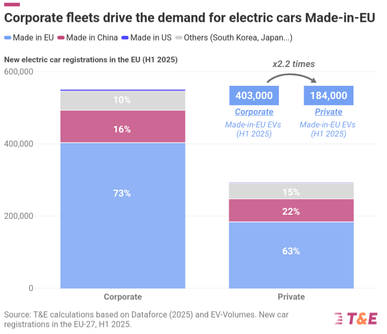 2. Electrifying corporate fleets brings more benefits for EU automotive industry 2.1. Companies buy more Made-in-EU EVs Looking at the registration data of the first half year of 2025, companies tend to prefer purchasing more EVs that are made-in-EU than private households (73% against 63% for private buyers). Made-in-EU is defined as vehicles for which the final assembly line is located in the EU-27 (i.e. EVs of European brands that are produced in China and imported into the EU are not counted as Made-in-EU). Due to their high market share – 60% of new cars are corporate – and higher preference, there are 2.2 times more Made-in-EU electric cars registered by companies than private: 403,000 compared to 184,000 in just the first half of 2025.