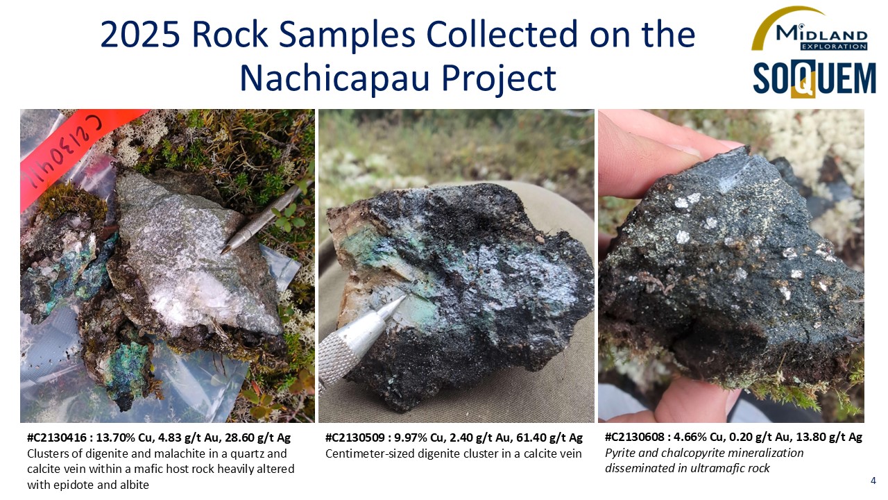 Midland and SOQUEM Discover New Copper, Gold and Silver Showings Grading up to 13.70% Cu, 4.38 g/t Au and 65.40 g/t Ag on Nachicapau