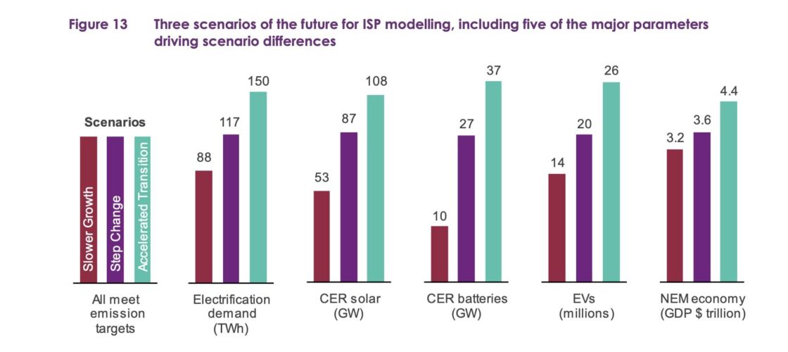 It could be a lot more. The ISP is based on the “step change” scenario that is considered the most likely and is seen as the “optimal development path.” But technology changes quickly and AEMO cannot rule out an “accelerated transition”, considered likely by 27 pct of stakeholders, as many who voted for “slower growth.”