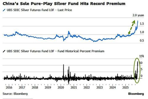 The UBS SDIC Silver Futures Fund LOF is currently trading around 12% higher than the value of its underlying assets, a record premium over Shanghai Futures Exchange silver contracts that suggests a wave of speculative interest.