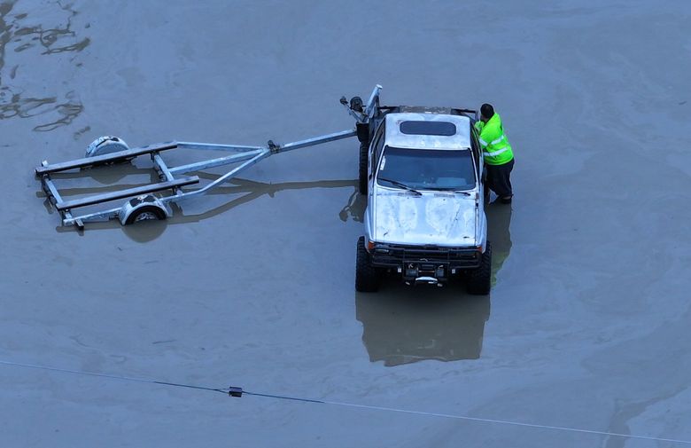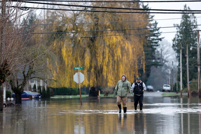 Meanwhile, on Thursday morning, a Washington Department of Fish & Wildlife swift-water rescue team maneuvered a boat through Hamilton near the Skagit River in Skagit County and found a woman standing on a porch. As the water rose past her porch steps, a rescue officer asked the woman how she was doing. In the video posted by the department, she apologizes, then says she’s scared.