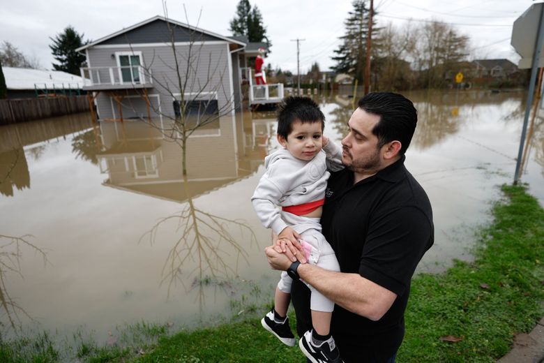 Mario Rincon holds his 2-year-old son, Daniel, outside their home, surrounded by water, in Burlington on Friday. Water from the Skagit River overflowed, flooding the neighborhood. (Karen Ducey / The Seattle Times) By Seattle Times staff Mario Rincon stood outside his home with his 2-year-old son, Daniel, in his arms. The boy, unaware of the grim situation, kept asking to swim in the floodwaters. Rincon would soon put on waders himself to see the damage inside his flooded home.