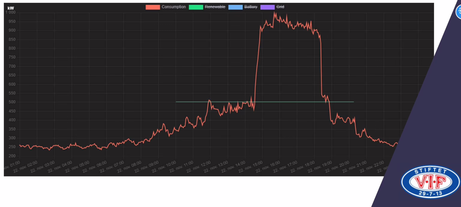 The image below, with the Vålerenga Fotball club’s logo at the bottom right, shows a typical match day consumption, with ramping load and a significant peak for full floodlights. Peak Shaper aims to cap the demand at 500 kW, and supply the rest of the demand via the battery.