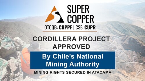 VANCOUVER, BC, Dec. 24, 2025 /CNW/ - SUPER COPPER CORP. (CSE: CUPR) (OTCQB: CUPPF) (FSE: N60) ("Super Copper" or the "Company"), is pleased to announce a major milestone at its flagship Cordillera Cobre copper project in Chile (the "Cordillera Cobre Project"), which has now received approval for 26 mining concessions from Chile's National Mining Authority ("SERNAGEOMIN"). These concessions cover approximately 6,858 hectares in the Atacama copper belt.