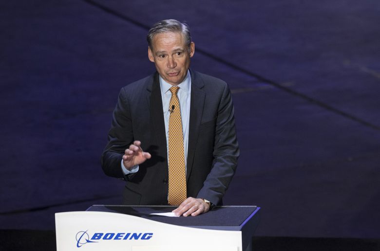 Boeing CEO Kelly Ortberg speaks at a press conference where attendees get to see a Boeing 787 with its new Alaska Airlines livery. (Ellen M. Banner / The Seattle Times)