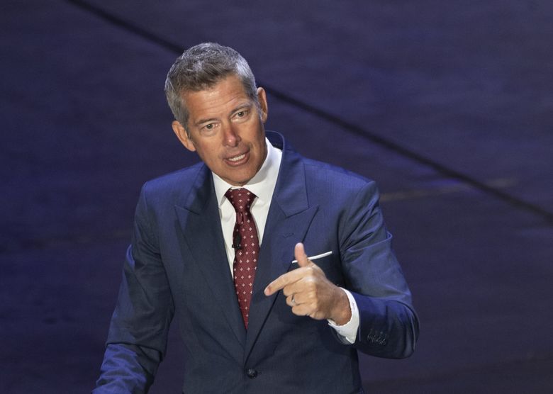 U.S. Department of Transportation Secretary Sean Duffy speaks at a Wednesday news conference at Boeing Seattle Delivery Center. (Ellen M. Banner / The Seattle Times)