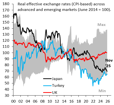 It’s gone under the radar, but if you look at the Japanese Yen in real effective terms, which means factoring in how it stands against all currencies around the world taking into account inflation differentials, the Yen is almost as weak as Turkish Lira, which is the single worst performing currency globally after President Erdogan eviscerated his central bank. The black line in the chart above is the Yen in real effective terms, while the Turkish Lira is in blue. For perspective, the British Pound is in red.