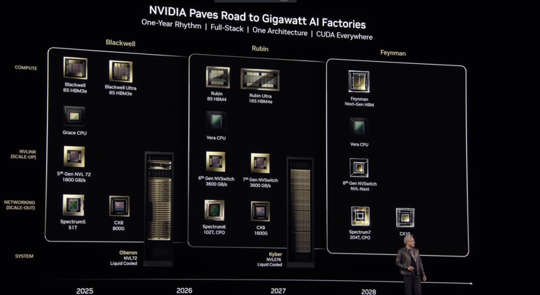 Feynman is the next major architecture on from Rubin and Rubin Ultra, which is set to arrive from 2028. Revealed at GTC last year, named after physicist Richard Feynman, Nvidia CEO Jensen Huang said very little about the tech specs of the new chip, but a slide behind him titled "Nvidia Paves Road to Gigawatt AI Factories" depicted the chip paired with a Vera CPU, IO, and network chips.
