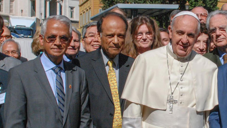 Ramanathan (far left) with Pope Francis and other researchers after a joint workshop of the Pontifical Academy of Sciences and Pontifical Academy of Social Sciences in 2014 at the Vatican. - Lorenzo Rumori