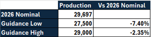 The Company also issued its 2026 production guidance, targeting 27,500 to 29,000 tU on a 100% basis (71.5 to 75.4 Mlbs), subject to availability of sulfuric acid. This implies a 2.4% to 7.4% discount to its revised 2026 nominal production level. Notably, that nominal level had already been structurally reduced in August 2025 from 32,777 tU (85.2 Mlbs) to 29,697 (77 Mlbs) – reflecting 5% of global supply. As a result, today’s guidance represents up to 9.8 – 13.7 Mlbs of production below that nominal reset.