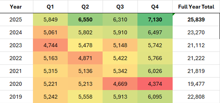 Kazatomprom (KAP) reported its Q4 and full-year results on Monday, delivering its highest-ever quarterly production of 7,130 tU, representing a 9% increase above the previous all-time high. This drove full year 2025 production to 25,839 tU (67 Mlbs), landing comfortably within the Company’s guidance range of 25,000 to 26,500 tU.