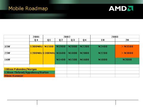 The good news seems to be that AMD is planning to reach 1.6GHz (M1900+) next quarter with Thoroughbred. (I believe that Intel will have 1.8GHz at the time.) The ramp looks a little slow after that. Could this suggest that maybe the rumor of AMD canceling the Barton core is true? I had figured that the mobile Athlon could reach higher than M2400 (1.93GHz) by the end of its lifetime with SOI. Maybe this is just a little reality check, or maybe Barton really was canned.