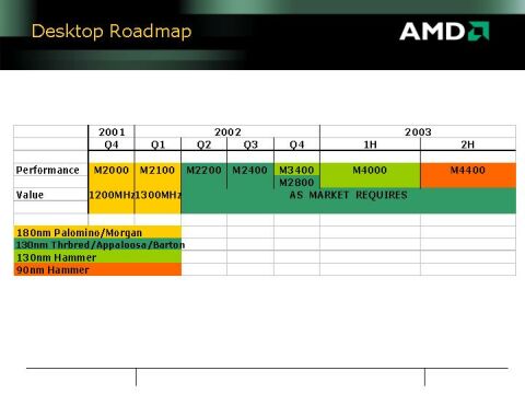 Also, Intel will have 2400 P4 in a few weeks (1st week of April, IIRC). AMD needs an 1867 MHz TBred by then to keep Sander's "no bigger gap in MHz" promise. I believe that would be XP 2300+. Somehow, I don't believe that will happen by early April, since the latest roadmap only promises 2200+ in Q2 and 2400+ in Q3. media.corporate-ir.net