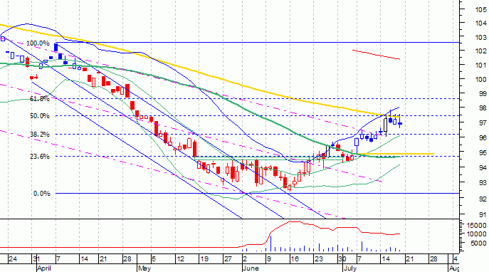 Around 94.67 (Sep futes) we have a gap, the 50 DMA, a neckline of a bullish male/female reversal (of which the target was met on the 100 DMA).