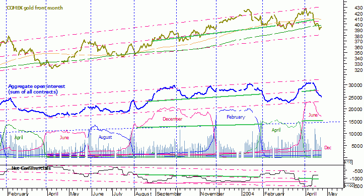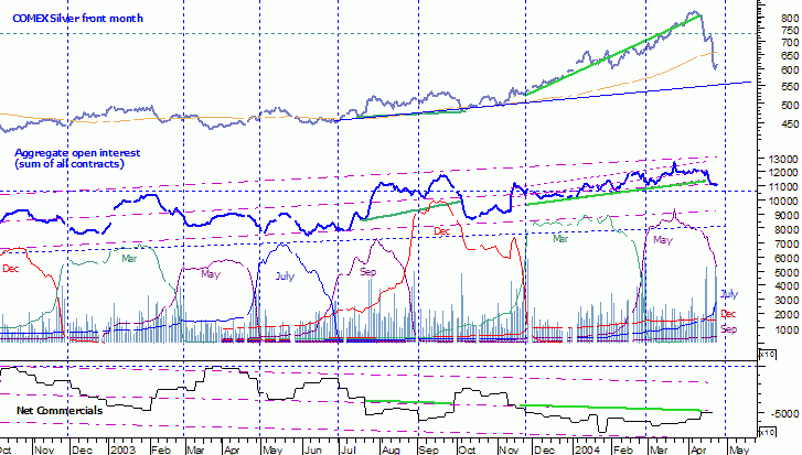 To: Cogito Ergo Sum who wrote (4806 ) 4/25/2004 1:57:50 PM From: Louis V. Lambrecht Read Replies (2) | Respond to of 60911 Didn't have much time this weekend commentimg my OI charts on the metals, here there are raw:lvlamb.itgo.com lvlamb.itgo.com In short: silver total open interest is at the low range of a stealth rally, and tho. the price dropped 25% (so, sends me back to school <ng>). Unexplainable, there is almost no wide swing in OI. Compared to last october when there was a huge drop in OI with a "normal" correction of 10% in the price. If "business as usual" and the net commercial shorts shrink (above the fat green line) there should be further correction in the price. Ouch! Gold total OI is close to the low end of the channel, should shrink a little, then start increasing again, leading to an increse in gold prices. And this is confirmed by the CoT net short positions close to the upper channel and about to have run course. (Commercials about to revert their position again). Still have tto work on these OI figures as I observed that only two values are of importance: total reportable non-commercial long positions (= speculative interest which sustains prices) and the cange in commercial long positions (commercials loading on the long side, at first sight, a ROC on commercials longs is one of the keys). Observd that net positions are not indicative. Have to structure all those data in a workable database. But in summary, as for now, my charts tell me that PoG has almost run it's correction (hence my 375-385, which would please me <g>). Problem is, that PoS, on the same set of charts, is far to have corrected, which does not corresponds to phoney-mentals. Unless the stability in total open-interest is the one to watch, which implies a strong stealth rally, no matter which prices are printed. Silver currently is a market for people with titanium cajones <vbg>. All this to say that I can't make an opinion. LOL. Btw: what happened to the Kastel & Co, Inc.?