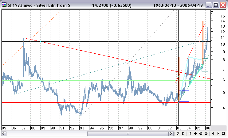 Fat orange are the measure and target of the bullish pennant which built through 2003-2005.