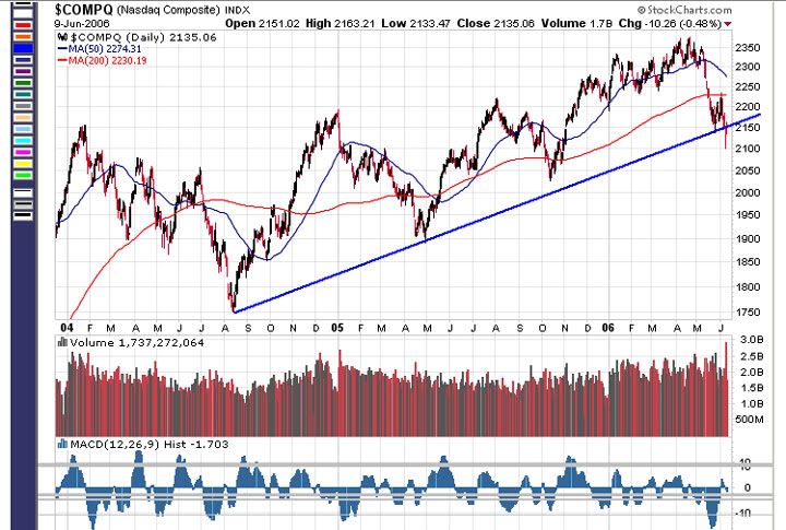 That's what makes a market. I am primarily watching the COMPX now and how it behaves around this trendline support. We should be due for a nice bounce.. for how long, I have no idea. Still primarily daytrading, here.
