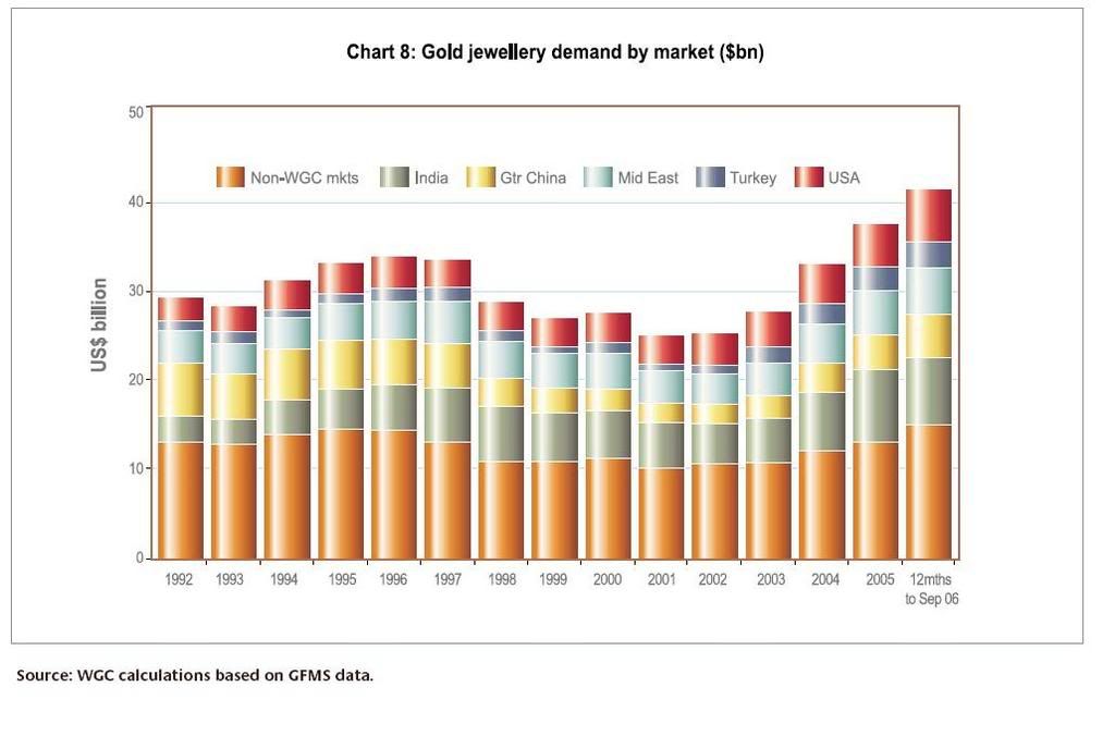 To: Fun-da-Mental#1 who wrote (4096 ) 12/11/2006 9:29:24 AM From: hubris33 Read Replies (1) | Respond to of 50716 Oops, it does look like ETF was double counted. Good catch, my bad. Looks like I'm human after all. That said, there are a few key points about the post we should discuss: the purpose and then the statement about demand having to equal supply. I think that the point is that there was a post here that stated that there were huge drops in various aspects of the demand side of the equation and used that as support of a theory that gold prices had to crater as a result. Examination of the facts from the same site used to supply the demand data shows that, [using WGC data] demand and supply are nearly balanced. But also, as discussed in my replies, supply is not in a growth mode. This is key; should one look at just one side of supply - demand relationship, but rather both sides?So demand and supply are basically equal, which they have to be, as long as the market is liquid. For every buyer, there is a seller. If demand actually exceeded supply, there would be a waiting list to buy gold [Ah gee, can someone help me out with this? I'll take a stab, but my economics isn't what is could be.....]The premise that demand has to equal supply makes no sense to me. Certainly instantaneously one cannot sell more than is produced, but demand is a function of wants by the market place. It is the changes in demand that drive prices either up or down, no? If the demand exceeds supply there isn't a "waiting list" to buy gold, rather the price of gold goes up. The POG keeps going up until the buyers have less desire for gold at higher and higher prices. Conversely if demand is low then prices can drop. If one reads the WGC text it is clear that these forces are currently in action. When the POG shot up to the 700+ level in the Second Quarter 2006 demand fell off. However, when the POG fell to the 570 to 600-range demand was rejuvenated and buying came back into the market. IMHO a key point of the articles is that the buyers now see the 570 to 600 range was a good bargain and a point at which one should buy gold. Apparently in early 2005 the level that was perceived as a good bargain was the 420 to 440 range.Nonetheless, high volatility took its toll on the jewellery market. It was only as the quarter drew to a close that demand from this sector began to re-emerge, thereby redefining a new price floor. But another key part of the story is a look at the supply side. Let's look at the summary from the "Gold Demand Trends" publication that I cited.Gold supply was 12% below year-earlier levels with all components contributing to the fall. I think that the key point here is that mines, which supply 62% of the gold, are in a period where production is expected to remain relatively flat for the next couple of years. So part of the story is how is the rest of the demand is met. Either additional supply comes on the market or prices rise, no? So the demand, not supplied by increasing production from mines, has to come from either official sales or recycled gold. But wait, the official sales are capped on an annual basis and thus if there are more buyers out there wanting more and more gold and the demand can not be met by sales from Central Banks it has to come from elsewhere or an increase in prices, no?. But if demand goes up perhaps there will be a big increase in recycled gold as people rush to melt down those numismatic coins, their dental fillings or other things. But the only thing that should spur an increase in recycled gold would be higher prices, no? It looks like on a rudimentary level (as best I can tell, perhaps someone can add additional info?) that for prices to keep increasing there needs to be an increase in demand. I think the theory that most Gold Bugs buy into as support for higher demand is the fact that two cultures where gold is important, namely China and India are have a surge in their middle class and thus an increase in disposable income which is expected to lead to an increase in the demand equation going forward. Apparently the market works, as demand did not stay strong when the POG went over 700, however, demand did rejuvenate at the 570 to 600 level, establishing a new floor, which is a nice increase from the 420 to 440 floor from 2005. So how long does it take for consumers to get use to the 570 to 600 level as the floor and build a willingness to bid he price higher? Finally, the figures stated to support the 'anti-Gold Bug' argument were quarter-to-quarter comparisons. Perhaps a look at a longer-term chart is in order? Here is a year-to-year chart of jewellery demand. It looks like from this chart that demand is on an up trend YOY, no? Now I suspect that because Gold is more than just a commodity used to produce things that there are other forces in play as well. Also, as stated my econ understanding is basic at best so perhaps there are other factors to be considered? Perhaps we can discuss those issues? H3