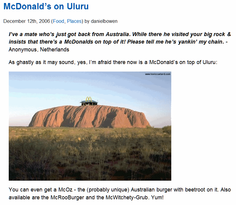 Ignore d:oug. There is no McUluru. The aborigines would riot. Since the Sons of the Transportees have given Australia back to them, they'd evict them. :-)