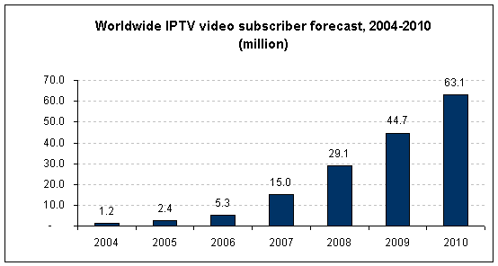 To: pcyhuang who wrote (1489 ) 8/16/2007 11:21:49 PM From: pcyhuang Respond to of 4080 Interesting Rd: IPTV subscriber base set for explosive growth ISupply reports: The worldwide subscriber base for Internet Protocol Television (IPTV) services is expected to expand by a factor of more than 26 from 2005 to 2010, spurring a competitive battle between video providers both old and new, research firm iSuppli predicts. Global IPTV subscribers will grow to slightly more than 63 million in 2010, rising at a stunning compound annual growth rate (CAGR) of 92.1% from 2.4 million in 2005, noted the firm. The IPTV subscriber base will generate more than US$27 billion in overall IPTV services revenue in 2010. While video services will account for the largest portion of these dollars, value-added media services and IPTV operator advertising will combine to represent more than 14% of IPTV services revenue in 2010. Furthermore, across all IPTV services, the corresponding content licensing revenue will reach US$11 billion in 2010. Source: iSuppli, compiled by DigiTimes.com, August 2006 "The fight to capture the expanding base of IPTV subscribers will put telecom operators on a collision course with existing pay-TV market competitors and with a new class of broadband video portals as they roll-out progressively more sophisticated offerings," said Mark Kirstein, vice president of multimedia content and services for iSuppli. iSuppli categorizes market deployment of IPTV services in three phases. The current global IPTV market is early in its first phase: basic service deployment. The second phase will add an array of value-added and interactive services. Phase three will bring dramatic improvements in integration and interactivity. Thus, in this pending battle for subscribers, providing a competitive video offering is merely the cost of entry for IPTV operators. Differentiation of IPTV services will be essential to bringing new capabilities to TV-based entertainment and attracting subscribers. Areas of differentiation will include: Interactivity, such as communication, community, voting, interactive advertising and television commerce (t-commerce); integration across multiple platforms, across voice and data services and across content types, i.e. video, voice, music, gaming, data services and user content; personalization, including intelligent TV recommendations, individualized advertising and non-linear video programming, such as video-on-demand (VoD) and digital video recording (DVR); and value-added services, including on-demand gaming, music, media applications, home networking management, security and data. Beyond the video service providers themselves, an array of companies will benefit from new opportunities arising from their roles as the "arms suppliers" for the battle over the next generation of television distribution. These companies include infrastructure gear manufacturers, set-top box (STB) makers, software vendors and semiconductor suppliers, iSuppli predicts. On a geographic basis, the European market has taken the early lead in the global IPTV market, both for subscribers and for revenue. However, Asia will generate faster growth than the other regions and will achieve the largest subscriber base by the end of this year. The Americas region will lead the world in terms of IPTV dollars starting this year because it will yield the highest average revenue per user (ARPU). Full story: digitimes.com pcyhuang