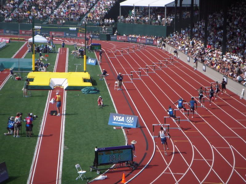 In the quarterfinals, Gay let up at about 80 meters to coast in. At the line, he was passed by three guys, and had the same time as one other guy..only 4 moved on. He got 4th, but, he easily could have been out. Then, a couple of hours in the semifinal, he ripped out of the blocks for a new American Record at 9.77. The 2nd place finisher, Dix, set a record for the fastest time by collegiate athlete, 3rd place was a high school kid that set the record for the fastest time by a high schooler! Three records in one race!