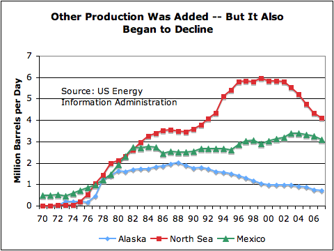 Case study of 3 regions. Mexico is currently down to 2.8 M BPD; down 11 % from a year ago. That is peak oil in action.