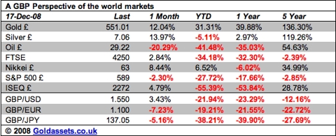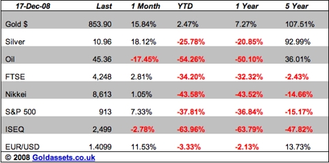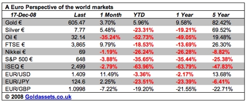 To: LoneClone who wrote (30453 ) 12/17/2008 9:52:31 AM From: LoneClone Read Replies (1) | Respond to of 194042 Gold Topped All Currencies in 2008 by: Mark O'Byrne December 17, 2008 | about stocks: GLD / UDN / UUP Mark O'Byrneseekingalpha.com Gold Investments Market Update The surprise move by the Fed to lower the Fed funds rate by more than 75 basis points to a record low and an unprecedented band between 0.25% and 0% led to sharp falls in the dollar (low of 1.4188 to the euro) and a spike in the gold price to over $859.40/oz. The Federal Reserve has embraced 'Helicopter Bernanke's' "inflate or die" massive reserve and money creation academic theories in an attempt to prevent deflation. Markets realise that this will lead to a lower dollar and higher gold prices in the medium and long term. Especially as Bernanke's money printing looks set to be less of a helicopter style drop of money and more of a B52 bomber drop of humongous dollops of liquidity and cash into the US financial markets and economy. The decrease to the lowest Fed funds rate ever in the US was greeted positively by stock markets but this will likely prove to be another instance of short term irrational exuberance. With ZIRP (zero interest rate) policies, the US and global economy and monetary system is entering unchartered territory which is leading to continuing safe haven demand for gold. 2009 looks set to be another very uncertain and turbulent year and the largest financial crisis since the 1930s continues to impact the global economy and financial markets. The financial markets and global economy remain in flux. Inflation won the early rounds prior to deflation clearly winning the middle rounds of the titanic "flation" battle. But the concern is that inflation and stagflation will come out swinging in the following rounds. The taboo 'hyperinflation' word may soon become more familiar to our lips as stagflation and deflation have recently. Bernanke's academic knowledge of the Great Depression and Japan's 'Lost decade', while useful, is quite obsessive and myopic. He would do well to also study Weimar Germany as there are parallels with America's massive predicament that are increasing by the day. Gold Is One of the Few Asset Classes to Have Increased in Value in 2008 While gold is some 15% lower than its record high above $1,000 an ounce, hit last March, it is important to state that gold is one of the few asset classes up for the year. Gold is up 7% in USD terms, over 10.5% in EUR terms and over 39% in sterling terms (see Performance tables), clearly showing its safe haven credentials. Gold did fall in US dollar terms as the US dollar rallied strongly in recent months. But, while gold fell from a record nominal high of just over $1,000/oz, it is important to remember that it is only down some 15% after surging nearly 60% in the previous 7 months. In the seven months from the start of the credit crunch and the collapse of Bear Stearns, gold had surged by nearly 60% - from $640 in August 2007 to over $1,000 in March 2008. Thus after a 60% surge in just 7 months, gold had become overvalued and was due a correction. This is exactly what has happened and despite carnage in equity, commodity and property markets internationally, gold remains higher in 2008 in all major currencies including the strongest currency in the world – the US dollar.