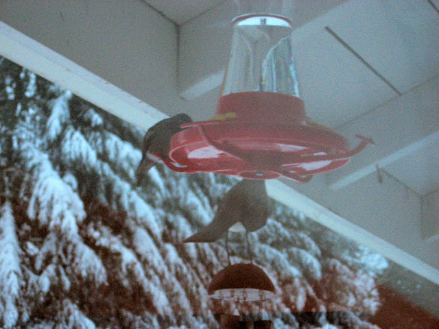 I have been bringing the feeder in at night to keep the water thawed. I had barely taken my hand away from it when I hung it out this morning when the hummer came buzzing in.......he was hungry.