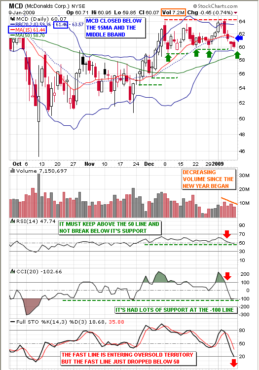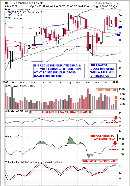 To: John Pitera who wrote (11284 ) 1/11/2009 10:02:16 PM From: zigzagman Respond to of 33421 MCD ~ Daily and Weekly Chart Analysis: I don't have time to do a Video Chart tonight, so I'll just add some text comments to these two charts... MCD is at the lower Bollinger Band, and it's had lots of support in this area since mid-December. If that support level fails, it has another one at $59.00 and then none until just above and just below $56.00 It has resistance at $63.00 and $64.00 many times. For the Bulls, it must bounce up from $60.00 this week. Bears want it to break below that level. Volume is diminishing, so that's good for Bears. Basically, it's been trapped in a trading range between $60.-64.00 since the first week of December, while it consolidates in an uptrend which is Bullish. MCD and WMT were the ONLY two stocks on the Dow30 to close in the green last year. That's pretty impressive. All six of the lower indicators on the daily chart have red arrows, so is convincingly Bearish. _______________________________________________________________ The weekly chart has fairly mixed indicators. It is still above the 15MA, the 50MA, and the middle Bollie Band, and the 50MA is still upticking. The big worry is that the 15MA will cross down through the 50MA, which is very Bearish. Last week's close was the lowest close in five weeks, but it's holding a level of support at $60.00 it's had for the past five weeks (so far). Last week's tall solid red candlestick that closed very close to the close of the week is a concern for the Bulls though. A candlestick of that type usually calls for another down week, and a somewhat smaller red candle. The Bulls do not want to see it close below $60.00 or the 15 and 50 Moving Averages, or the middle BBand... The lower indicators are a mixed bag: the RSI downticked and needs to stay above 50 for the Bulls sake. The CCI just barely downticked, and the Bulls want it to stay above the zero line. Stochastics actually moved up during a down week, and is now in Overbought territory. The MACD Histogram downticked last week, the fast line ran flat, and the slow line upticked, so the MACD is neutral. As is the ADX. The A/D line shows lots of sellers, and the Shorts like the fact that the A/D line broke below it's previous level of support. Happy Trading, zigzagman