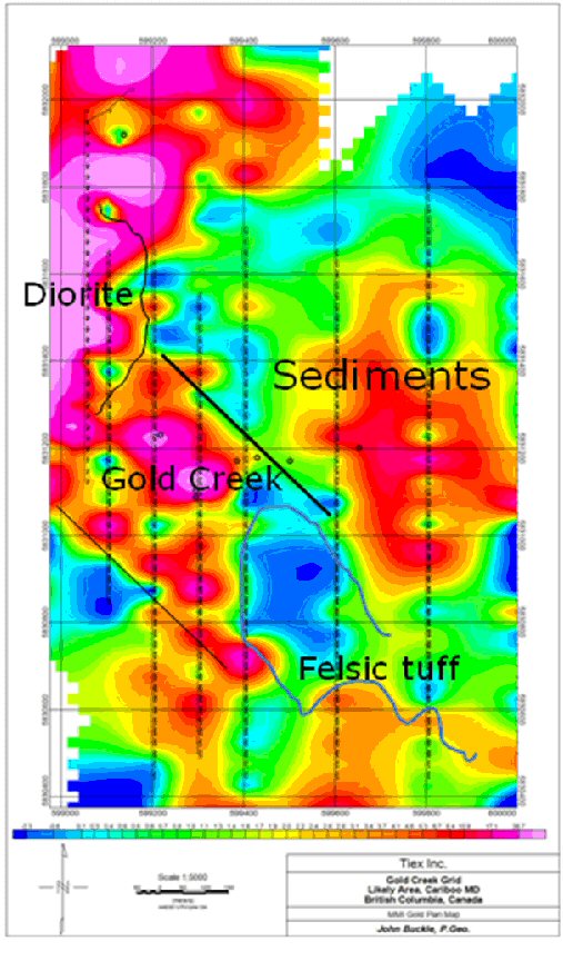 The Gold Creek zone occurs within a geologic environment that has the potential of hosting a shear zone quartz vein type gold deposit. The Company recently completed both induced polarization (I.P.) and magnetometer geophysical surveys and MMI (mobile metal ion) surveys over the zone. The Company plans to conduct a 6,500 metre diamond drill program designed to test Tiex's Gold Creek and Horsefly properties. To date, the Company has completed 11 holes totalling 1,568.13 metres on the Gold Creek zone.