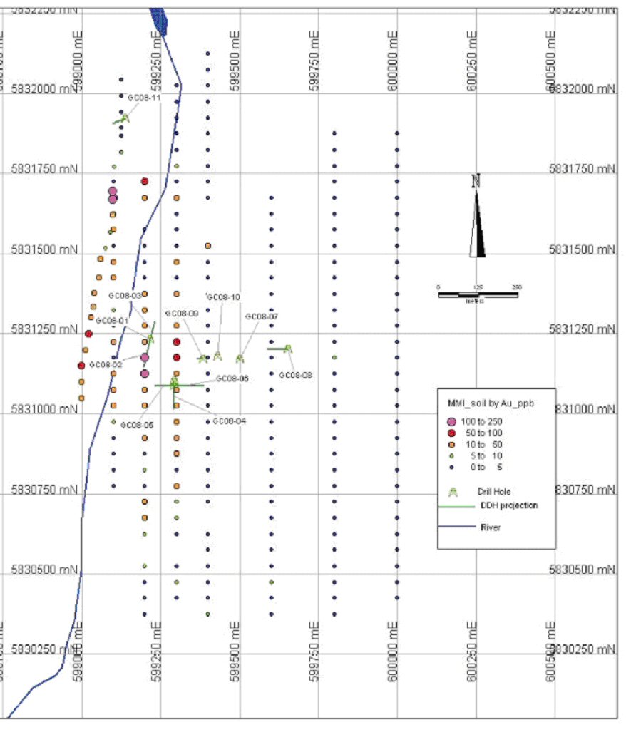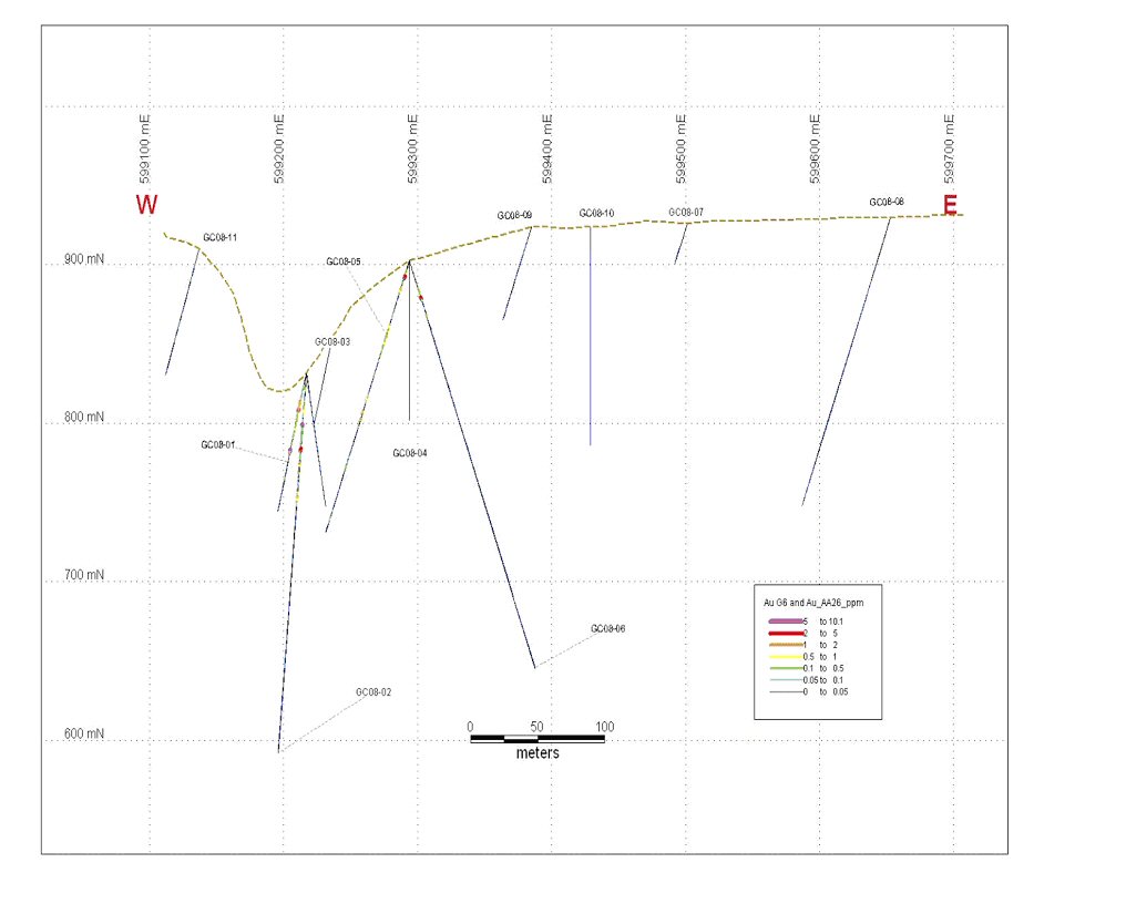Intersection Interval ---------------------------------------------------------------------------- Drill From To Length Au Hole ---------------------------------------------------------------------------- (m) (m) (m) g/t ---------------------------------------------------------------------------- GC08-01 Mineralized 10.34 96.02 85.68 0.551 Zone ---------------------------------------------------------------------------- Enriched 10.34 70.1 59.76 0.736 Zone ---------------------------------------------------------------------------- Includes 22.34 34.48 12.14 1.401 ---------------------------------------------------------------------------- Includes 64.01 70.1 6.09 2.615 ----------------------------------------------------------------------------