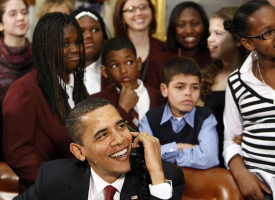 Obama Calls Space Shuttle, Flanked By Schoolkids (SLIDESHOW)