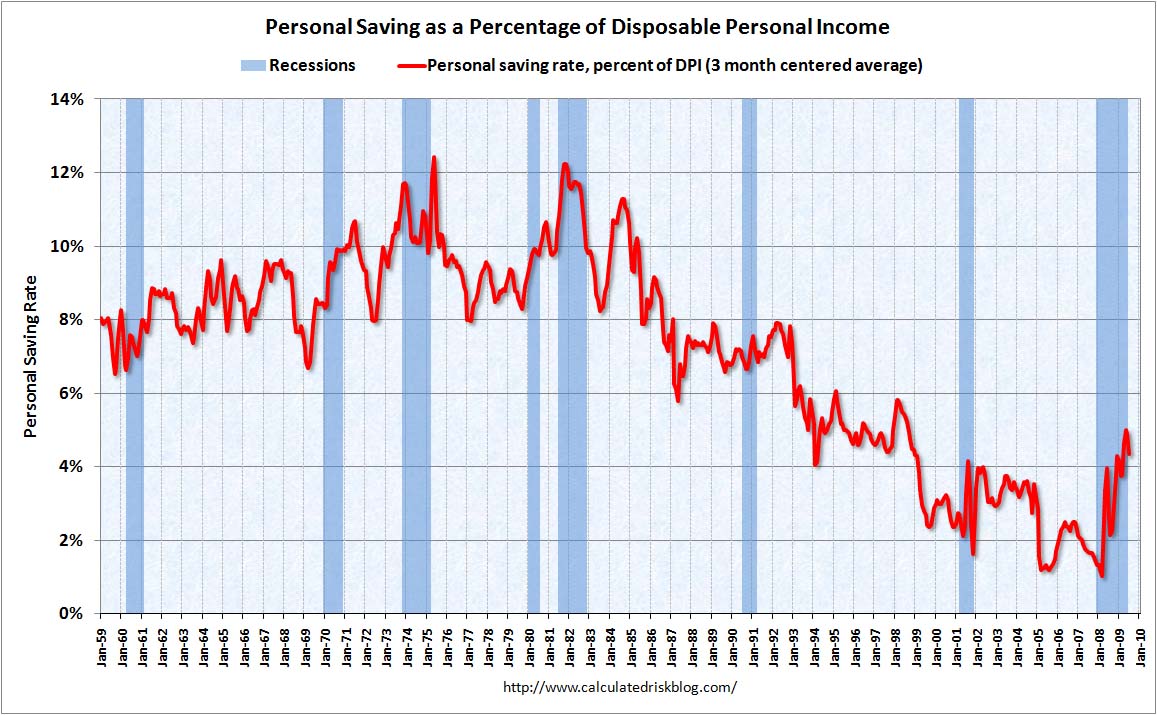 Here is the US savings rate as a percent of income. In the last year, it has shot up to levels last seen a decade ago. If it keeps going up at the same rate, in a year or so it will approach the 10% level last reached in the early eighties, when the US trade deficit was near zero: