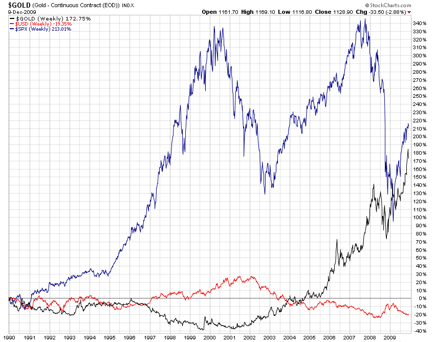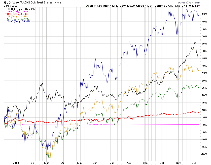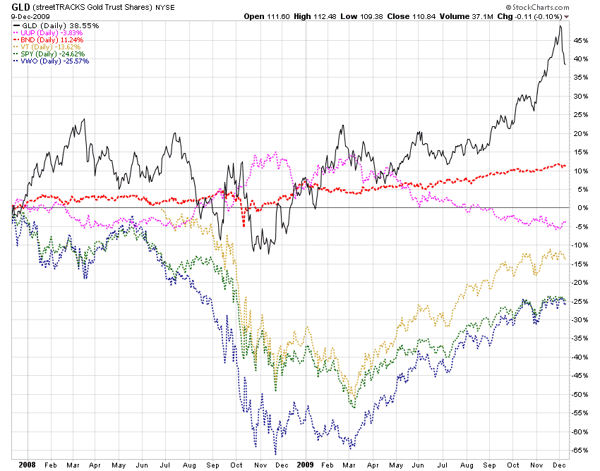 To: GROUND ZERO™ who wrote (23346 ) 12/10/2009 2:37:11 PM From: DuckTapeSunroof Read Replies (1) | Respond to of 103300 One more look at GOLD over recent decades: All That Is Gold Does Not Shine 6 comments by: Richard Shaw December 10, 2009 | about: AGG / BND / EEM / GLD / IAU / SHV / SPY / UUP / VGK / VT / VTI / VWO seekingalpha.com The well worn phrase, “All that shines is not gold” can be turned about when talking of investing in gold to say, “All that’s gold does not shine.” Gold has been a fine investment as of late, but how has it done over a long period? How about over a lifetime of investing in comparison to other major assets, such as 3-month Treasuries, US aggregate bonds, and all country world stocks? We have data to answer that question from 1976 (34 years ago, and around about the time this author began saving for investment in an organized way). If you began with $100 in each class in January 1976, and taxes were deferred as they could have been in a Keogh plan, or if the account were tax-free as in a non-profit organization, the values of each position at the end of November 2009 would have been: * 3-month Treasuries (proxy: SHV) - $648.92 * US aggregate bonds (proxies: AGG and BND) - $1,576.19 * All country world stocks (proxy: VT) - $3,185.52 * Gold (proxies: GLD and IAU) - $814.49. So, over the long-haul of the past, gold was better than short-term Treasuries, but not as good as diversified bonds, and nowhere near as good as global stocks. That is not to say that gold will not be better than the others going forward, but we have been through tough times before, and in the end stocks won. We have serious doubts about US stocks (proxies: SPY, IWV and VTI) doing as well going forward as emerging market stocks (proxies: EEM and VWO), or possibly even European stocks (proxy: VGK). The key is the value of the Dollar (proxy: UUP) for the future of gold. The profligate public spending, mountainous national debt, negative import-export balance, anti-capital policies and wealth distribution goals of the government in the US today, and the multi-national call for a new reserve currency do not bode well for the Dollar. That gives gold a better long-term performance expectation relative to US stocks and bonds than it had in the go-go days of US stocks. Non-US and global stocks, however, may not be as negatively impacted by a declining Dollar as US stocks in general. The long-term decline of the Dollar against a trade weighted basket of currencies, does not fully explain the recent strong rise in gold, which seems to be anticipating something more like a global monetary collapse, which we tend to doubt (but if we are wrong, our stop loss orders on all our exchange listed positions will pull our fat out of the fire as they did in 2008 to save us from that devastation). Compliance Disclosure: We own GLD, AGG, BND, SPY, VTI, EEM, VWO, and VGK in some managed accounts. We do not own other mentioned securities. We are a fee-only investment advisor, and are compensated only by our clients. We do not sell securities, and do not receive any form of revenue or incentive from any source other than directly from clients. We are not affiliated with any securities dealer, any fund, any fund sponsor or any company issuer of any security.