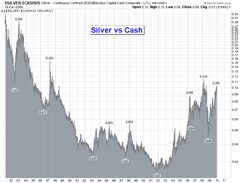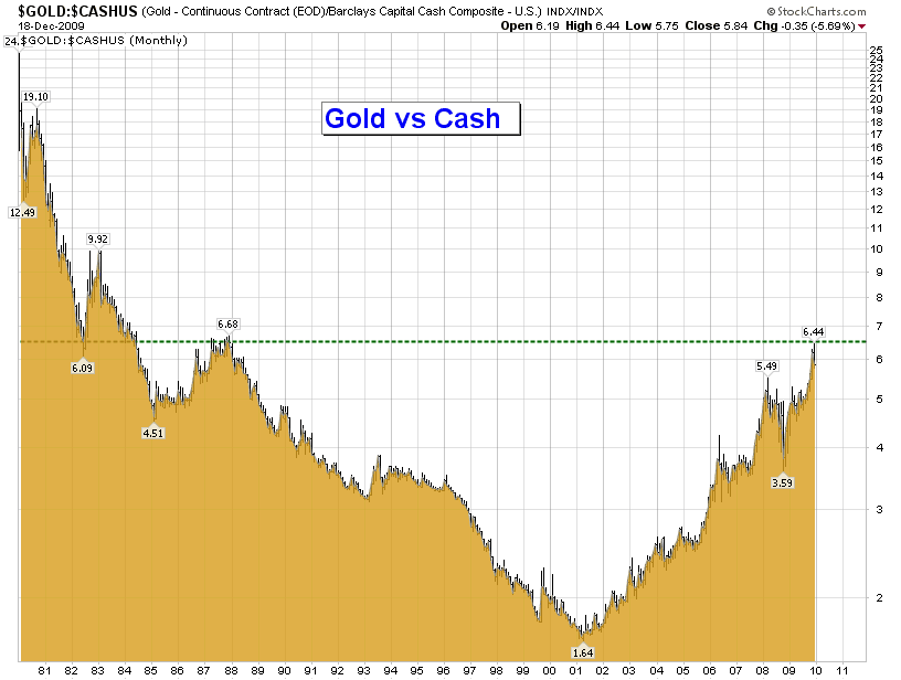 Here is a chart of the gold price divided by the 'Barclays Capital Cash Composite' going back to 1980.