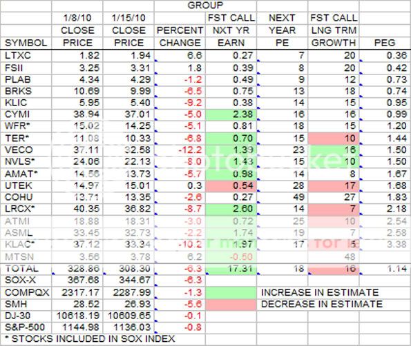 This is the same Group data as the last post, but this time it is sorted by PEG. Here it is relatively easy to see the results of growth reduction estimates. Two of the hardest hit were LRCX reduced to 7 percent growth and KLAC reduced all the way down to 5 percent growth.