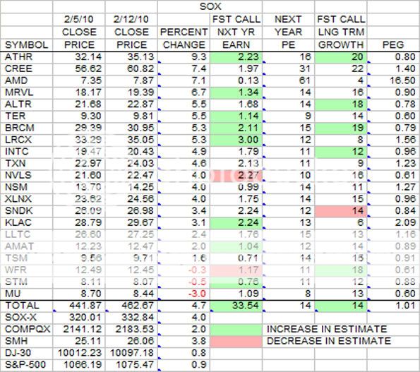 This is the weekly update for the SOX stocks in terms of earnings estimates, growth and prices. There are many changes in the upward direction for both earnings estimates and growth.