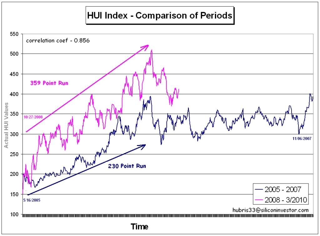 Take a look at this chart of the HUI. It shows the price of the HUI for two periods: from the low of 5/16/2005 through the point where it finally broke out of its trading range around 11/06/2007. The second line is the recent period where POG started its rally from a low around 10/27/2007.
