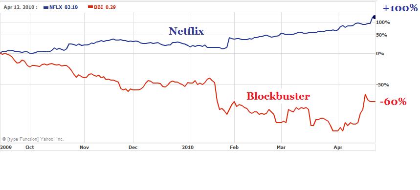 To: i-node who wrote (289 ) 4/24/2010 9:46:40 AM From: Glenn Petersen 2 Recommendations Read Replies (1) | Respond to of 2280 Aside from reporting their first quarter results, I could not find anything that would have accounted for the pop. Perhaps a bit of this......Analyst: Consoles to add millions of Netflix users .....and the realization that their distribution model has won the game (at least for now):"The Model Has Changed" aka Creative Destruction: Netflix (+100%) vs. Blockbuster (-60%) Mark J. Perry CARPE DIEM Friday, April 23, 2010 SACRAMENTO BEE -- First, people decided they didn't want to drive to the movie theater. These days they aren't too keen on driving to the video store, either. In a sign of the times, Netflix saw its stock price top $100 a share Thursday after posting blowout earnings – the same week that another Blockbuster outlet closed, this one on 29th and K streets in Sacramento. Blockbuster and Hollywood Video are closing local outlets as nationally, both companies feel the heat from game changers like Netflix and Redbox, which rents movies for $1 a night out of vending machines in supermarkets. Brick and mortar video stores are under pressure from the online world, just like record stores and booksellers before them. We want to rent DVDs quickly by mail or pick them up at the supermarket. And that's if we bother handling a physical disc at all. Increasingly, we just stream movies on laptops and smart phones or download them right to our PlayStations or Xboxes, so we can watch them on our flat-panel TVs. "The model has changed," said Maithu Bai, owner of Awesome Video, an independent video rental store on Freeport Boulevard. "It's not just here; it's across the nation. In these times, people want something new." MP: The chart above shows that since last September, Netflix stock has more than doubled while Blockbuster's stock has declined by more than 50%. Posted @ 10:47 PM mjperry.blogspot.com