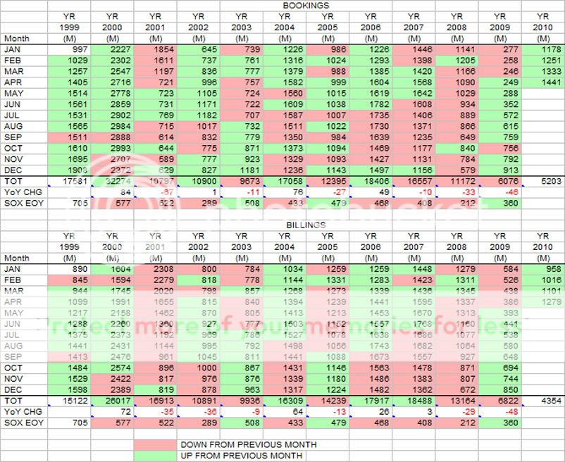 Bookings, Billings and BtB continue to roll upward. This is good news for the future, but the market has not embraced this situation since the beginning of the year in terms of stocks prices. As posted on a weekly basis, earnings estimates have continued to increase to take into account the rise in Bookings and Billings since the first of the year(and really since Apr/May of 2009).
