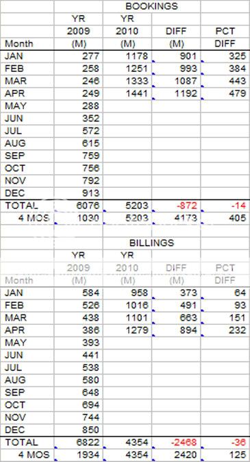 This is a more detailed look at Bookings and Billings comparing the results for 2009 and 2010. Bookings for the first 4 months of 2010 are only 872M less than the total for all of 2009. Bookings for April were 479 percent greater than April of 2009. For the first 4 months of this year, Bookings are 405 percent better than the first 4 months of 2009.