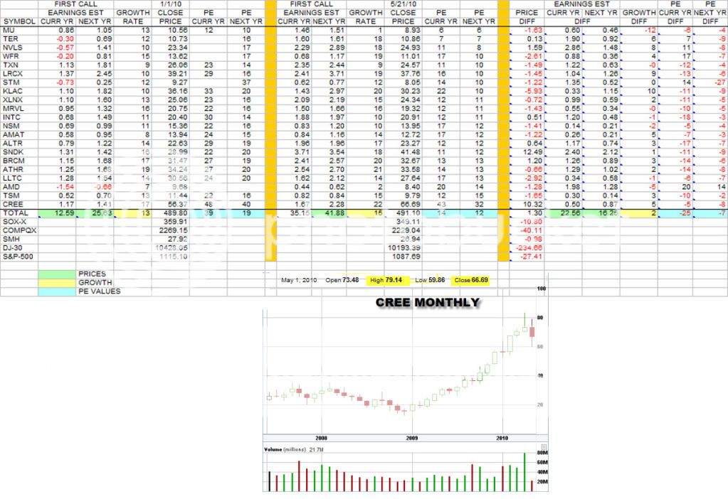 This sort shows all PEs fall in a relative narrow range from 6 to 15, but one stock, CREE, jumps to a PE of 32 residing in last place. CREE has been in a correction mode this past month as shown by the chart. During May the stock has traded as high as 79.14, as low as 59.86, and closed Friday at 66.69. With the SOX being a price weighted index, CREE is the biggest contributor to the index and therefore has a lot of influence. No one knows what CREE will do going forward, but with its relatively high PE, both Curr Yr and Nxt Yr, it may have more price correction to the downside ahead.