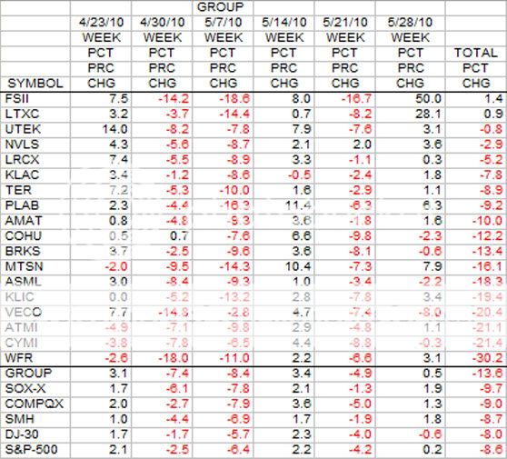 This is the longer 6 week look at the Group stocks in terms of percent change. Over this period a big sea of red. Only FSII and LTXC are not in the red. Ten of the 18 stocks are down over 10 percent or more. At the bottom line the Group is down 13.6 percent.