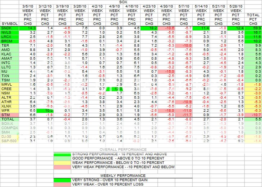 This is the update of the 13 week rolling quarter for the SOX stocks in terms of percent change. Just like the 6 week picture, SNDK is in front by a large margin with a 59.9 percent gain. STM is in last place with a 10.7 percent loss. Eight stocks have losses over the period.