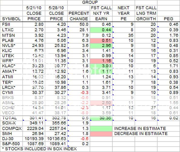 This is the weekly update for the Group stocks in terms of earnings estimates, growth and price changes. Only a slight gain of 0.5 percent for the Group this week. VECO took a pretty big hit with an 8 percent loss.