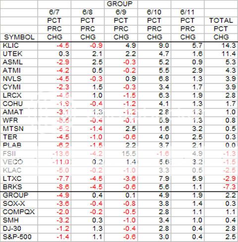 This is the look at the Group stocks for the week in terms of percent change. The week started out on a down note, but then began to recover as the week unfolded. Thursday was a strong day to the upside while Friday followed through in the positive direction. As a result, all indices at the bottom line finished to the upside. KLIC and UTEK finished up over 10 percent. Five of the 18 stocks finished in the red.