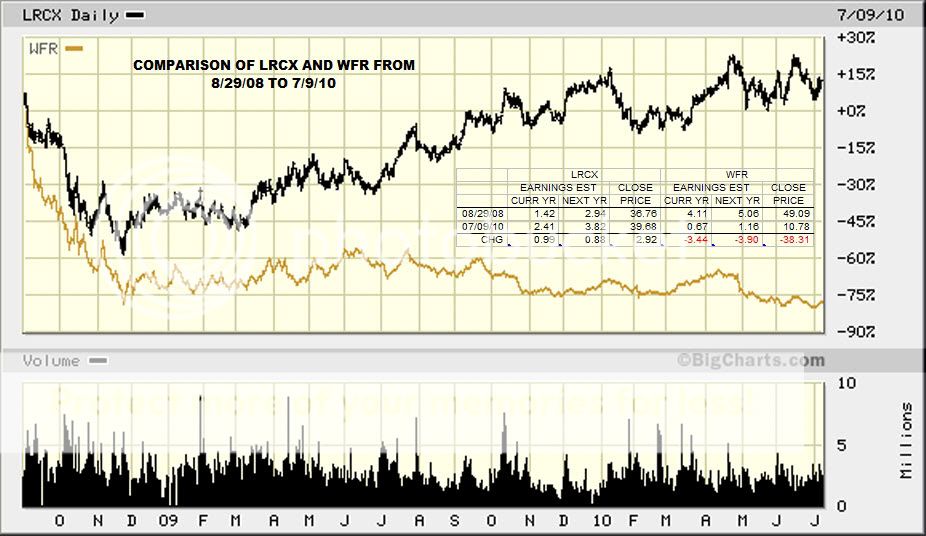 This is a follow up chart that shows the action of LRCX and WFR over the life of the table from 8/29/08 to this past Friday, 7/9/10. Tabular data on earnings estimates for the 2 end points are shown on the chart.