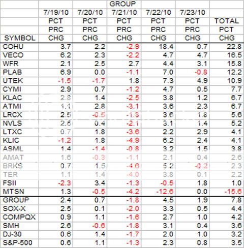 COHU was the big winner for the week with a 'blow out" quarter and more to come for the 3rd quarter. It was up 18.4 percent on Thursday, and managed to add another 0.7 percent on Friday. MTSN was in last place, down 15.6 percent after missing its estimate by 0.01. The estimate was for -0.16 and the actual was -0.17.